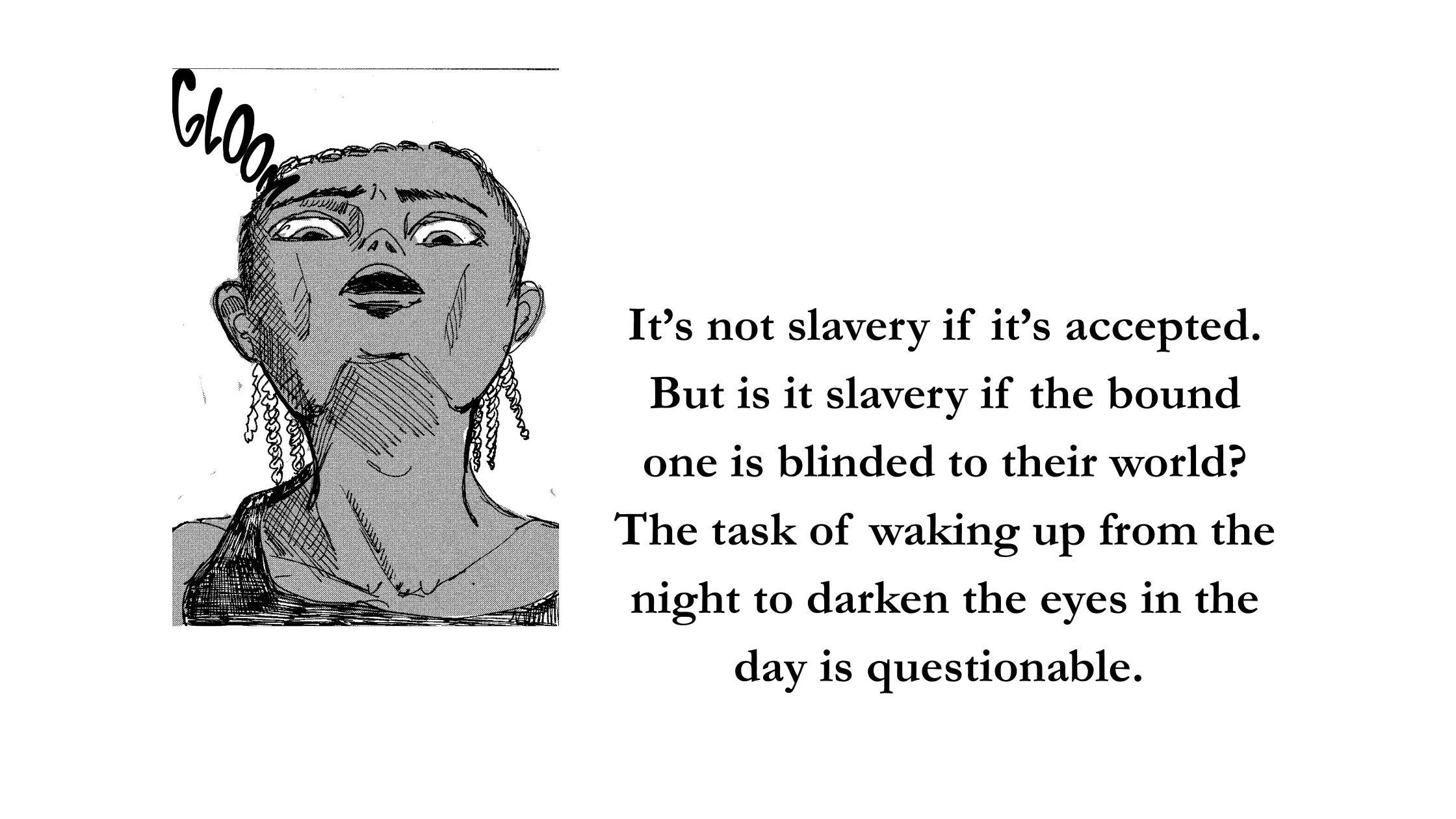 It’s not slavery if it’s accepted. But is it slavery if the bound one is blinded to their world?